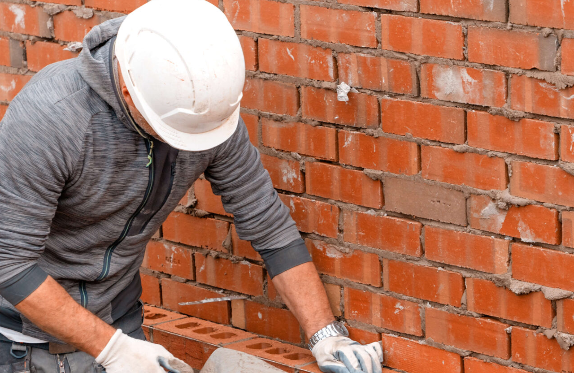 Stone Haven Developments A construction worker in a white hard hat and gloves lays bricks while building a brick wall. Ontario